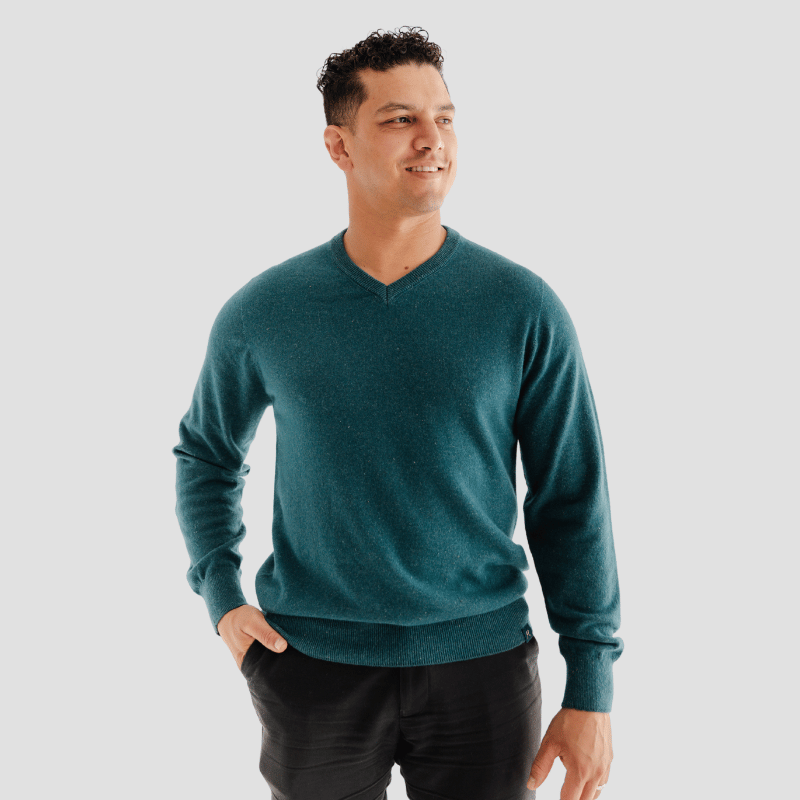 Elevate your everyday style with the Hemprino™ Classic V-Neck in Teal - a versatile, unisex knit that brings together sustainable luxury and effortless wearability. Made from our signature 80 percent ZQ-certified merino wool and 20 percent hemp-fibre blend, this lightweight jumper offers breathable comfort, natural warmth and a timeless silhouette.